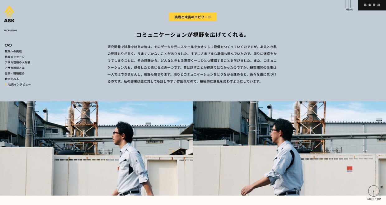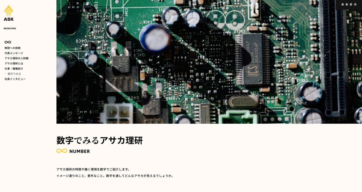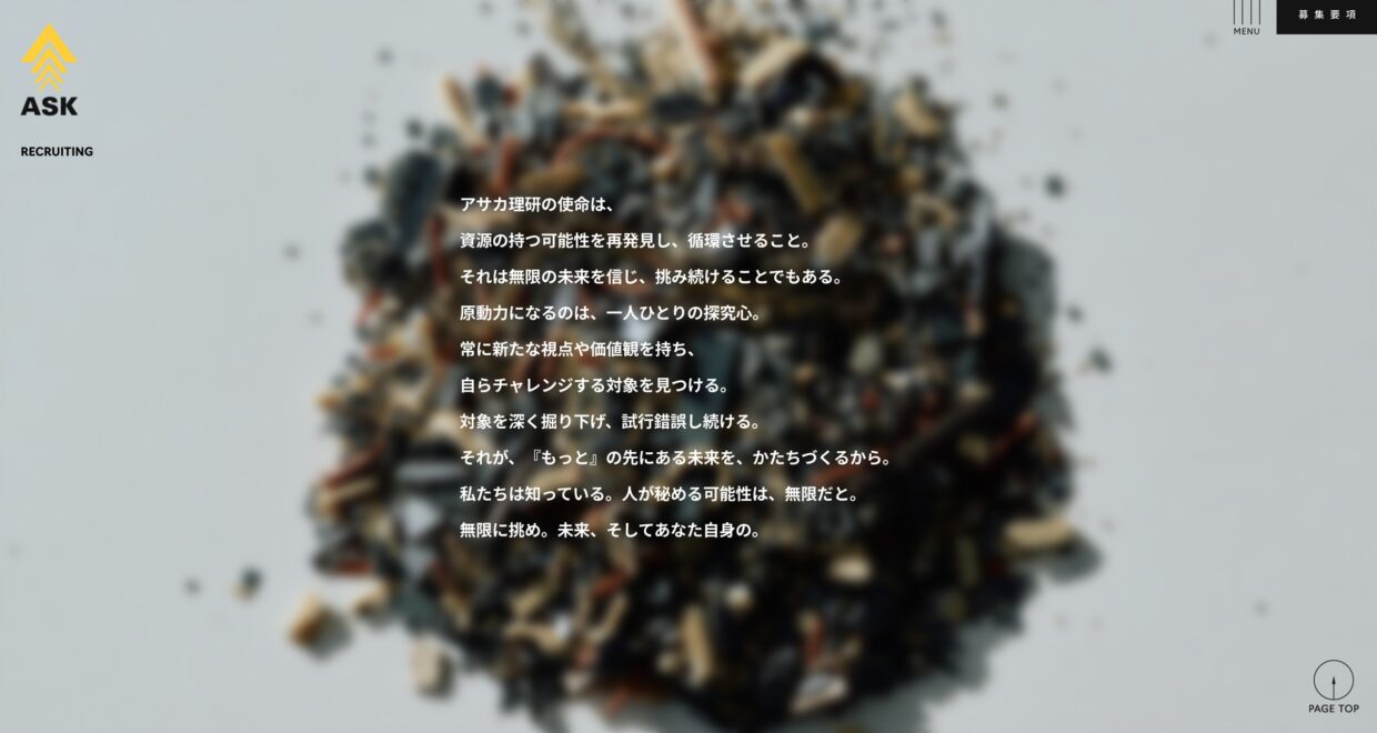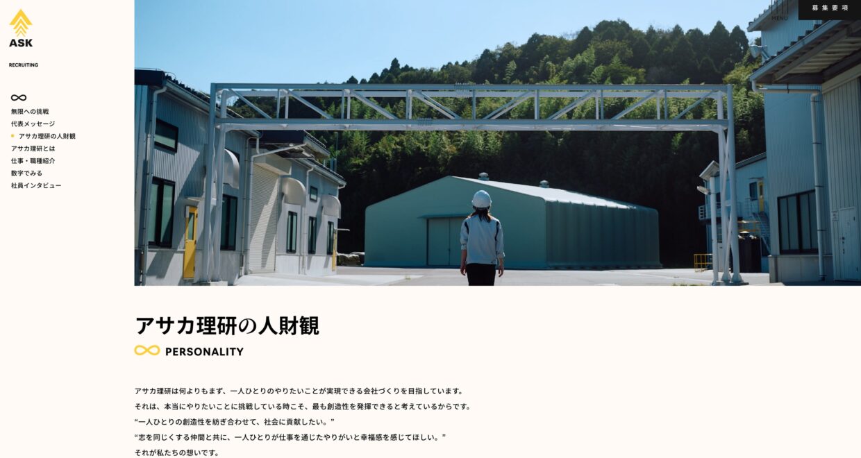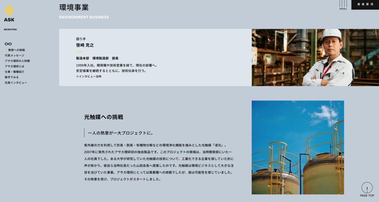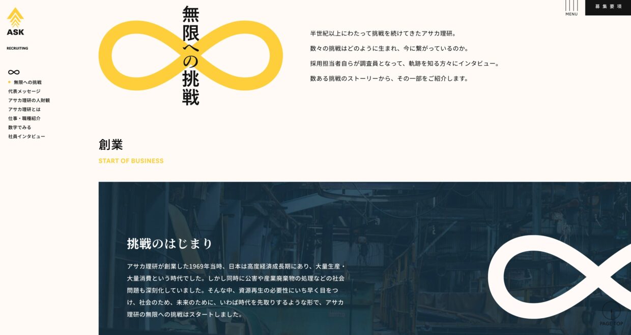 「豊かな創造性を発揮し、社会貢献を果たす」を社是として掲げ、まだリサイクルが社会に浸透していない時代から環境保全や資源の有効活用を目指し発展してきたアサカ理研。2022年のコーポレートリブランディングに合わせて採用サイトも刷新。採用ステートメントに掲げた「無限に挑め」には、社員一人ひとりの根幹にある探究心が込められている。