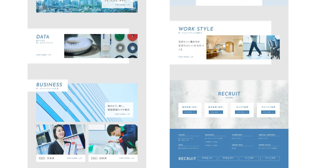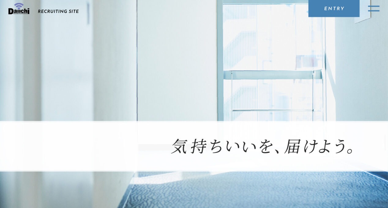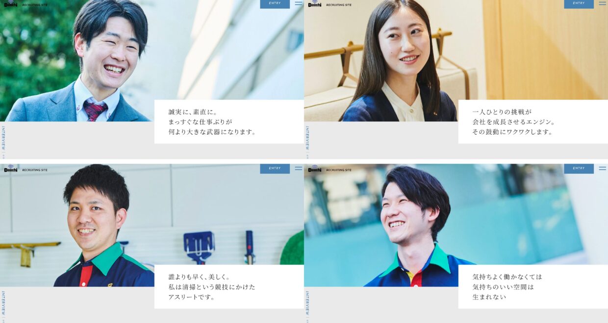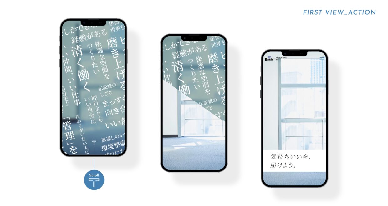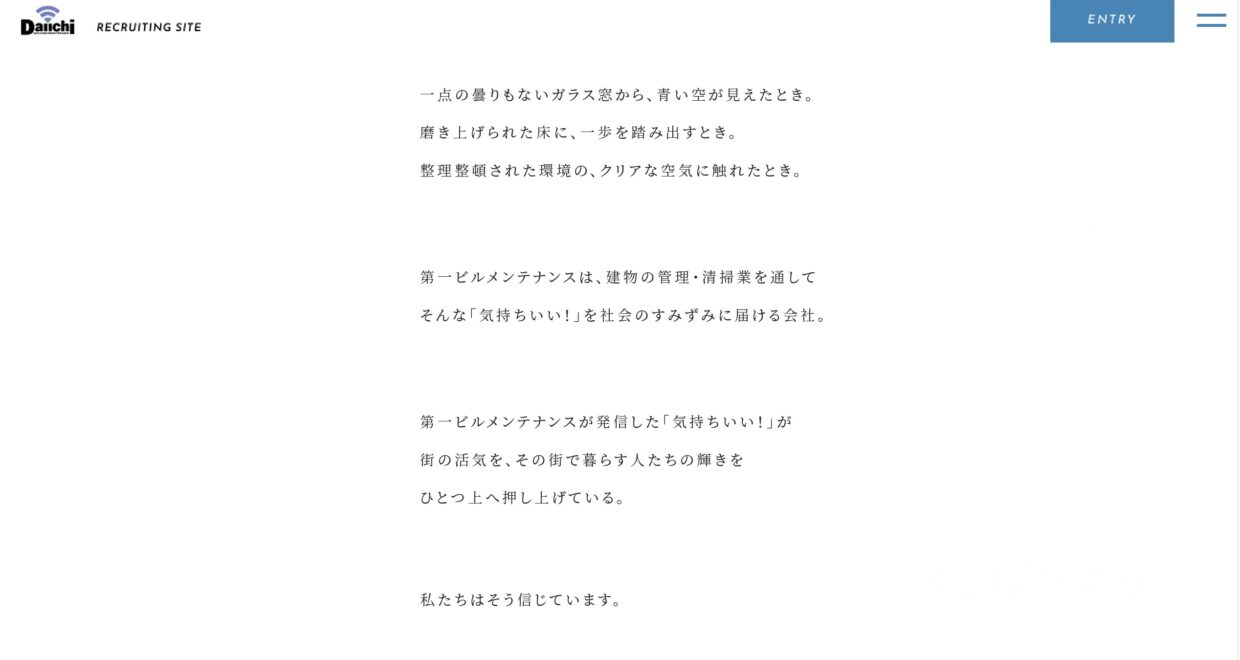 「建物の清掃・設備保守・警備」を通して人々の日常を支える第一ビルメンテナンス。採用の課題は、最終的に求職者に選ばれず内定辞退されてしまうこと。コンセプト「気持ちいいを発信しよう。」をもとに採用サイトを設計。まっすぐで誠実な「人」の魅力、仕事の細部にまでこだわる姿勢、そのための日々の努力を見せることで、表面的なビルメンテナンスの印象を超えて誇れる仕事であることが伝わるようにしました。