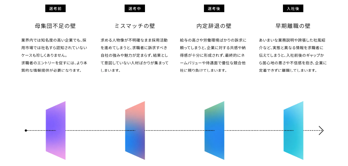 多くの企業が採用活動を進める上で直面するのが、「母集団不足」「ミスマッチ」「内定辞退」「早期離職」という4つの壁です。これらの背景に共通しているのは、企業の強み・魅力・働く価値が求職者に正しく届けられていないという問題です。