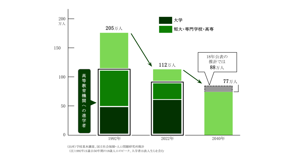 採用市場が売り手優位へと変化する中で、「なかなか応募が集まらない」「採用しても定着しない」といった課題を抱える企業は少なくありません。その背景にあるのは、急速な少子高齢化によって引き起こされる「人材不足」という問題です。実際に、2040年には18歳の人口が77万人にまで減少(2022年比の7割弱に相当)するという推計も発表されており、これからの日本は今後数十年にわたり慢性的な労働力不足に直面することがほぼ確実となっています。大企業でさえ人材獲得に苦慮するこの流れのなか、中小企業もその影響を受けることになります。
